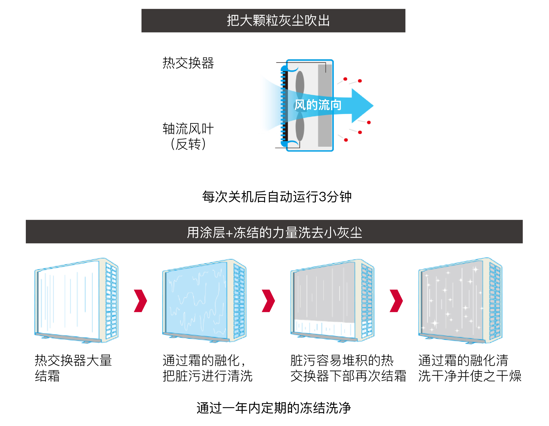 設備在每次關機后室外機風葉會反轉3分鐘進行清潔作業。