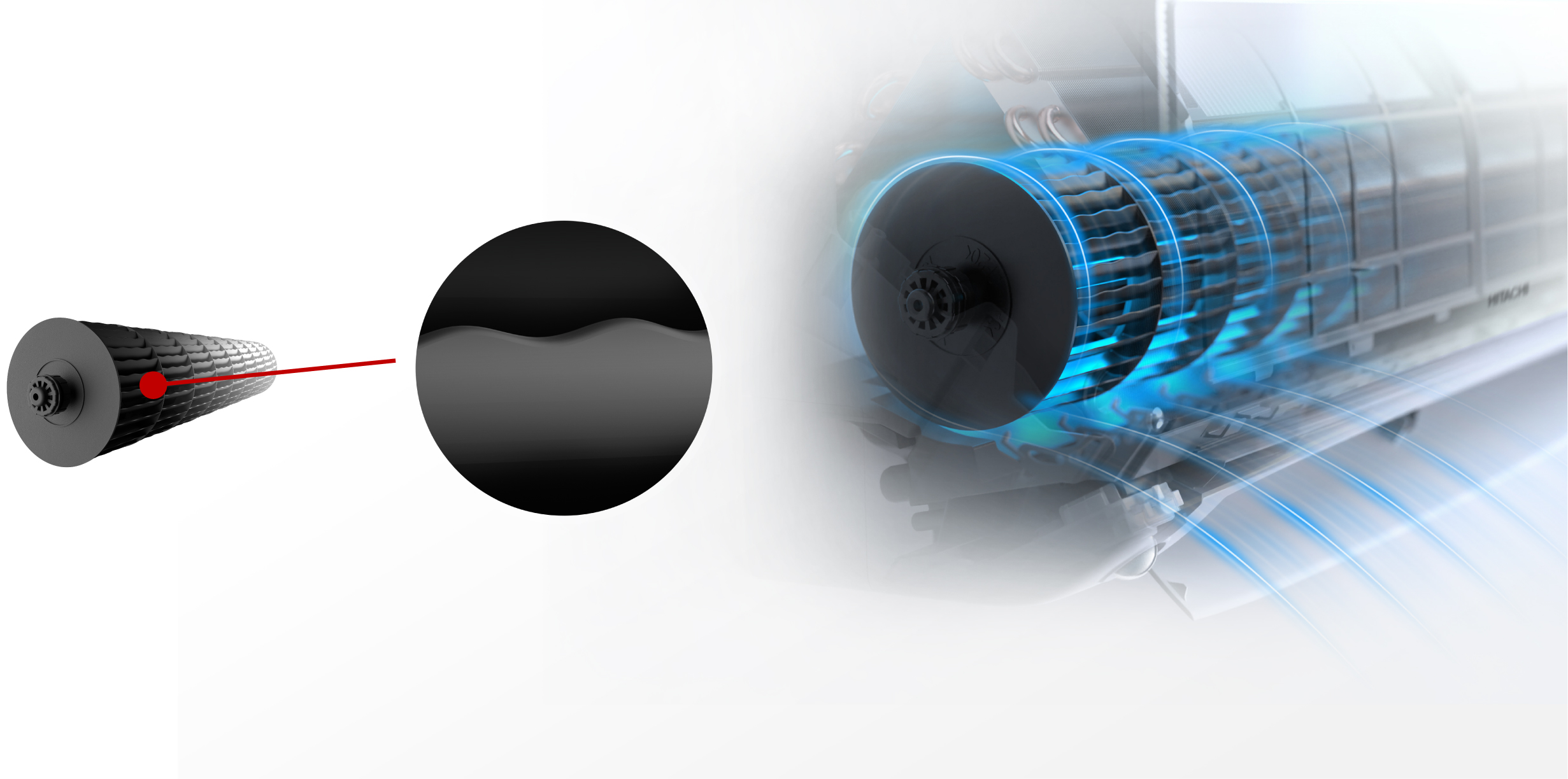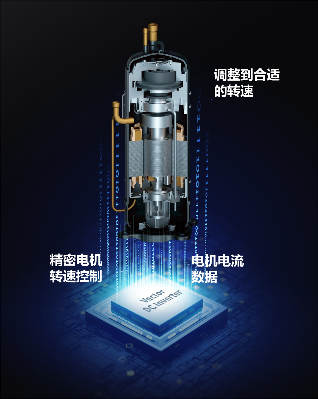 我們的矢量直流變頻系統配備了一顆微芯片來控制壓縮機的轉速。優化了形狀和電極設計的轉子可以有效抑制電磁噪聲,并優化低速運行時的能效。