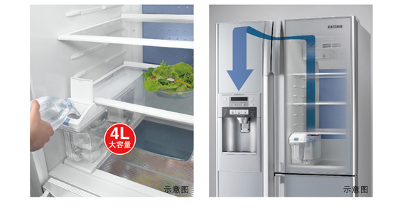 礦泉水、蒸餾水或冷開水等注入內置儲水盒的飲用水,流經3層水源過濾網后,便會自動制冰。儲水盒給水系統無需連接水管,可省去外接水管及過濾裝置的麻煩。冰箱放置更加自由方便。4L大容量儲水盒,可取出清洗,潔凈方便。